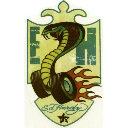 Original art by Ed Hardy in bold, bright colors featuring a cobra on wheels with flames coming out of the back. Size is approximate. Tattoo, metal, biker.